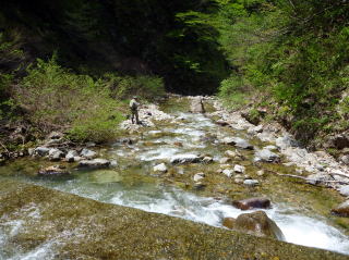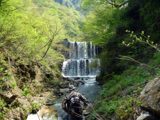 | さて、二日目の4月30日(木曜日)、朝はゆっくりで7時半に起床。 昨日の自転車などで筋肉痛かなと思いきや、そうでもない。やはり事前の準備運動のおかげかなと思ったが、よくよく考えたら、この歳では痛みがでるのは2〜3日後なんですよね。なんて事を話しながら、パンやコーヒーで朝食を済ませ、出発の準備をした。 途中のコンビニで昼食を仕入れた、本日は「小川」の上流を目指すのだ。 『朝日小川トンネル』を抜けると、3月にお世話になった「小川温泉」が現れる。道横に車を止め着替えを済ませて、いざ出発となる。時間はすでに10時を過ぎている。 「小川」沿いの林道を歩き始めた途端に前方から、釣り人が5〜6人ほど降りてきた。手にはビクらしきものを提げており、何やら魚らしき物が入っているようだ。しばらく行くと再び釣り人とすれ違ったが、手にはイワナやヤマメの入ったビニール袋をぶらさげていた。連休ともあって人も多いようだ。 さて、この小川温泉上流であるが、3月に来た時に川沿いにある「天然洞窟風呂」に入りとても癒されましたが、女性専用露天風呂も川沿いにあるのだ。もちろん囲い塀も無い。林道は対岸にあるので距離はあるのだが、あまりジロジロと見る訳にも行かない。チェックアウトの時間も過ぎていることだし、幸か不幸か誰もいないようであった。だが、目の前にある大堰堤にはさすがに竿を出せなかった。 本流筋はたぶん先ほどすれ違った人達が竿を出している可能性が高いし、初めての河川なので支流へ入ってみることにした。雪代の入った本流を浅瀬を選んで渡ったが、かなり冷たい。 地図を見るとすぐに堰堤が現れるはずなので、とりあえず目指した。そしてその堰堤はすぐに現れた。 途中に新しい足跡もあったが、気にせずに竿を出してみることにした。 |
