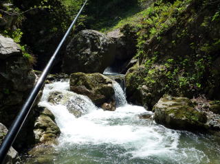 | 最初の堰堤は左側から高巻くことが出来た。 堰堤の上は、最初は開けていたがすぐに落ち込みが連続する素晴らしい渓相だ。 良型を連発した「つかさくん」すでに満足したようで、竿をザックに仕舞いこんでいた。 私と遅ちゃんで好ポイントを攻めるが、アタリも無い。 水中の写真も撮ってみたが、よく判らなかったです。 |