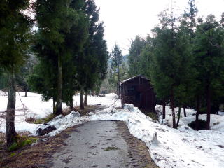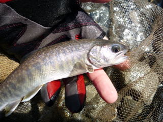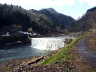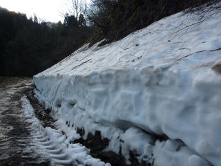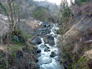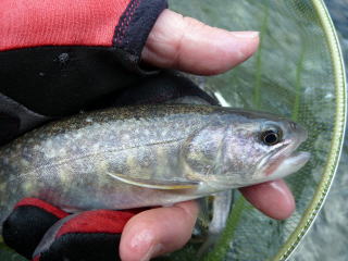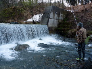 | これだけ水温も低いと魚の活性も低くなっている。少しでも暖かい場を求めて移動した。 そして結局、いつものポイントへ行くことにした。やはり川に下りる道には雪は残っている。数年前の悪夢がよみがえる。 行きはよいよい帰りは何とか・・・。それでも釣りたい一心で雪道を下ってゆくのであった。 堰堤に到着すると、川幅一杯に広がった流れに圧倒される。 それでも近寄ると大量の水飛沫。一度挑戦したが、数分ももたずに退散。 根性もなにもない。釣れる気配も感じられないので直ぐに下流へ移動した。 下流の小堰堤は流れも少し緩いポイントが幾つか点在しているので、分かれて竿を出した。 日当たりの良い場所を選んで釣り座を確保。粘っていると、泡の下で反応があり、やっと今年最初のイワナが釣れてきた。サイズは20センチ弱であったが、ホッとした。 つかさくんも丁度釣り上げたところで、ニッコリとしていた。だが、この後つかさくんは得意の小堰堤ポイントで次々とイワナを連発し始めたのであった。 わてはというとあれ以降はアタリなし。つかさくんのポイントにお邪魔して2匹程追加したがリリースサイズのみ。 相変わらずマイペースで釣り上げているつかさくん、生かし魚篭の中を見ると良型もしっかりと入っていた。 |