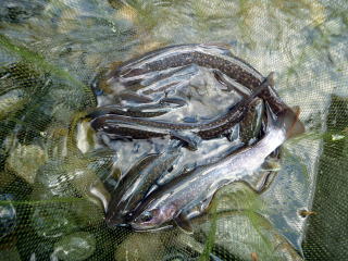 | 小堰堤から下流のポイイントへ移動。ここでも増水でポイントが少ない。 やはり流れの緩い場所を選んで何度も仕掛けを投入し、やっとの思いで釣り上げたらメザシサイズ。やっとれんわ。 それでも粘るとやっと20センチオーバーが出ました。 寒いわ。眠いわ。無理はいけません。 午前10時半、早々に納竿ですわ。 |