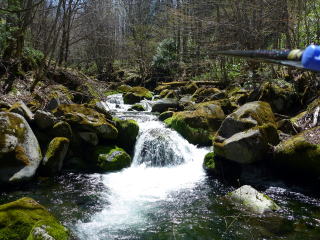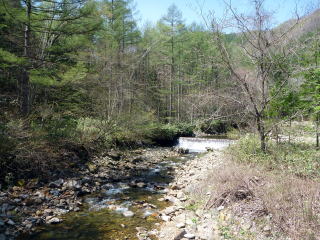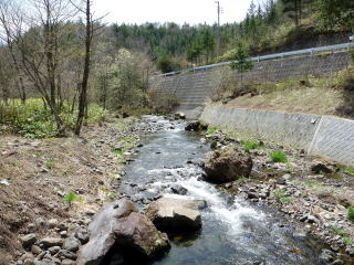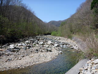 | 週末の土曜日、久しぶりに朝5時半という早朝に出発した。 今日は日帰りで「秋神川」様子を見に行くことにした。国道41号線を北上し、小坂の道の駅「はなもも」で休憩。 目の前の小坂川では放流が行われたのかたくさんの釣り人で賑わっていた。 鈴蘭高原では山菜もやっと出始めたようで、蕨などを少し採取した後に秋神川へと向かった。 鈴蘭スカイラインを抜け朝日町の秋神地区へ到着。しばらく上流へと車を走らせた。途中で右から支流が流れ込んでいて堰堤が見えたので車を乗り入れてみた。「白谷川」である。 川沿いのに道路が続いているのでとりあえず上流へ行ってみることにした。ナビの地図では道路が川を横切っているので、てっきり橋があるものだと思って登って行くと、本当に道路が川を横切っており橋は無かった。ジャバジャとシエラを走らせる。水量が少ないのでことなきを得る。途中で車を降り、川の様子を伺うと魚が走る姿が見えた。 あまりいいポイントも無さそうだし、本流との合流点にある堰堤で竿をだしてみた。仕度をしてポイントに到着するとつかさくんは竿を持ってくるのを忘れたようだった。 10mほどの川幅の堰堤を左から右まで探ったが全くアタリが無かったのでそそくさと引き上げる。 |
