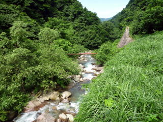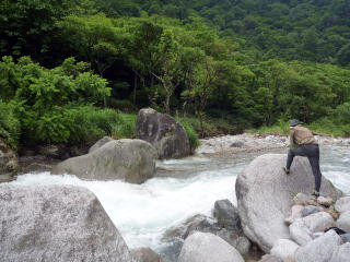 | 次はどうするだ、「小早月川」にでも行ってみるかん。まあ最初の計画通りではあるのだが、以前は崖崩れで通行止めもあったので今回の雨での影響も心配なのであまり奥には行けない。たしか途中まで車で入れる堰堤があったので向かってみた。 この時期は草木は相当に延びているので入るのは難しいと思っていたが、到着してみるとなんと堰堤に横付けできてしまった。 釣り人が手入れしたとしたなら、釣果は難しいのかも。まあこの大雨で少しでも魚が動いていてくれればいいのだが。 で、さっそく分かれて竿を出した。しばらく粘っているとつかさくんにアタリがあったようで、8m竿で思い切り抜き上げたが、思ったよりもサイズが小さかったのか魚が吹っとんで行った。わては全くアタリも無く惨敗に終わった。 宿に戻ると、連休ともあってキャンプ場は大賑わいだ。バーデン明日で温泉に入った後、8号線沿いにある「とんかつ定食」を平らげて再び戻ると案の定、バーベキューの真っ最中であった。明日は早く起きる予定なので9時半には無理やりふとんにもぐりこんだ。 |