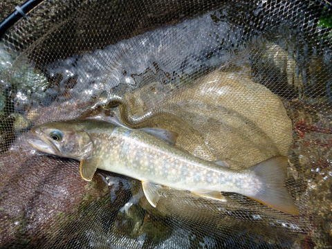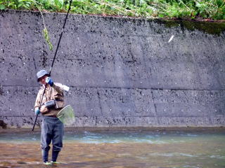 | 翌朝は6時に目が覚めた。しばらく散歩をして戻ってくると、つかさくんは昨日の酒にやられたようで、「調子こいてもうた」と嘆いている。さっさと朝食を済ませ釣りに出掛ける。 一番近くの「小川」の様子を見てみるが、増水ぎみでしかも濁りが入っているので上流は難しそうと判断した。 そして、困った時の「笹川」頼みという「根こそぎ隊」の言い伝えを思い出し向かって見た。 やはり言い伝えは正しかった。濁りもなく水量も申し分ない。さっそく釣り仕度を始めたが、つかさくんはまだ昨夜の酒が抜けてないのか、真っ直ぐ歩くにも苦労しているようでギャラリーとなった。 堰堤下に入りたかったが、草むらを掻き分けて降りる根性もないので、横着をして堰堤上から竿を出した。 キンパクは青海用に残しておきたいので、とりあえすバイオを針に通し、右端から丹念に流して行く。 前回、実績のあるポイントでも全くアタリが来ず、ついに左端近くまで来た時、一気に仕掛けが開きから落込み近くまで引っ張られた。 すかさず合わせをくれたが、針掛りしなかった。もう一度同じポイントを流すと再び、同じように引っ張られた。そしてまたもや針掛りしなかった。まさか二度とも同じ魚じゃないよなあと思いながら、今度はバイオから少し針の先が出るようにセットしてもう一度同じポイントを流してみた。 やっぱり来やがった。しっかりと合わせをくれたので針は掛かっているようだ。3回とも同じイワナなの? しかも結構でかいじゃん。 しかも、わては堰堤の上じゃん。抜き上げるのかあ?他に手はない、イワナを水面に引き上げで空気を吸わせながら時間をかけて弱るのをまった。そして一気に堰堤上まで抜き上げた。尺には届かなかったがヒレピンのいい型であった。 この後は全くアタリが無くなり、移動することにした。 |