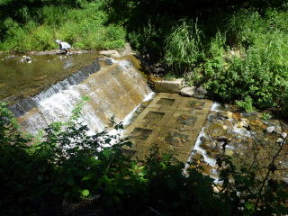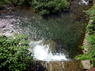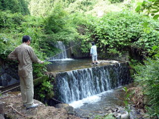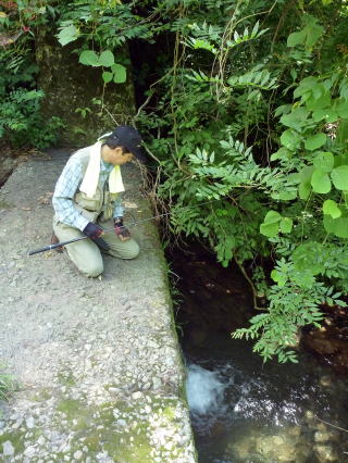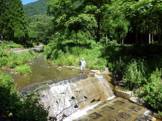| 再びアブの襲来の中、大物を求めて移動した。 そしてすぐ近くの橋の下で、大イワナが泳いでいるのを見せて貰った。ここでは誰も掛けたことが無いとのことで、どうやらスレッからしのポイントのようだ。 そんな事を聞けば、自称「大物つり師」としては竿を出したくなるっていうもんだ。 橋の上下で何度となく挑戦したが、掛ったのはチビウーチャン一匹のみという情けない結果となった。 次は、初めて連れてきた素人でも25cmほどのイワナが釣れたという絶好ポイントを紹介して貰う。ただポイントまでが草木で覆われていたので、サバイバルナイフで草をは払いながら入った。 そこは二段堰堤となっており、やはり絶好ポイントだ。残念なのは周りの木の枝が覆いかぶさっており釣り難いことだ。 遅ちゃんは上の堰堤へ行き、私は下の堰堤に挑戦したが、堰堤下には下りられないので上からのちょうちん釣りとなった。 しばらくして遅ちゃんにイワナが来たようだが、私に来たのは小さな「ハヤ」だけだった。 |
