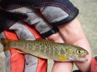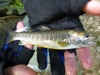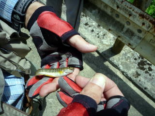 | 再び移動するも、車内に入り込んだアブを退治するのにも一苦労だ。 次は未だに語り草となっている「とっちんの幻の40センチポイント」を紹介してもらった。 噂ではとっちんが道路の上から堰堤の落込みで40センチのイワナを掛けたが、大きすぎて上がらないので2mの上から飛び降りてタモに収めようとしたが、掛けたイワナに両足の周りを廻られて、仕掛けを切られ逃げられたということらしい。 そのポイントに着いてみると落込みにはコンクリートブロックがしっかりと並べられており、ガックリとした。 それでも何とかポイントを探して竿を出してみると、すぐにアタリがあった。 釣れてきたのは小さなアマゴだった。もう一度流すと今度は18cmほどのアマゴが釣れてきた。何れもハリを飲み込まれていたし、道路の上から竿を出していたので直ぐに外してリリースした為、写真を撮り忘れてしまった。 これを見ていた遅ちゃんもやる気が出てきたようで、堰堤の上に降りて竿を出し始めた。そして手のひらサイズのイワナをGETしてニッコリしていた。 |