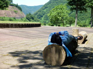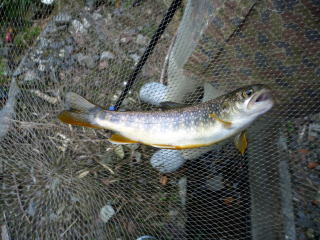 | 途中、「麻那姫湖青少年旅行村」で500円を支払い入場し、昼食休憩した。 しばらく昼寝したり、散歩をしてのんびりとしたが、トイレに立ち寄ると、何故か中におびただしい血の跡が点々とあってビックリしてそそくさと後にしたのであった。 もちろんこの後は「大野市」にある「星山商店」に立ち寄り、例のホルモンを購入した。 寒くはあったけど一応、釣りも出来たし、温泉と美味しい寿司も堪能でき、満足な一日でした。 帰り道で、「大納川」を覗いてみると堰堤の淵で大きなイワナがゆらゆらと泳いでいるのが見えたが、降りることも出来ないので見るだけとした。 また、白鳥まで戻り、支流で竿を出した。156号線沿いにある支流で、ここは「とっちん」が良型のイワナを掛けたが、つかさくんの強い要望で泣く泣くリリースしたと言っていたので、狙ってみた。 だが、つかさくんに小物が一匹釣れたのみであった。 予想では、とっちんがリリースしたという良型のイワナは、たぶん「とっちん」が後日釣ってしまったのではという見解になったのでした。 |