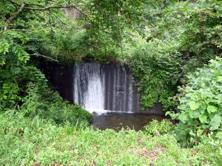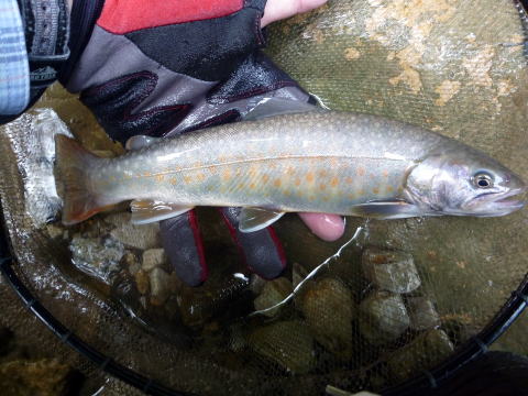 | この後、上流のアイサワ谷へ行ったのだが、物凄いアブの数で車から降りることもできす撤退となった。 しかたなく、発電所前のログハウスを覗いてみるとお留守のようで、脇に張り紙があり9月11日に「川まつり」なるものを開催するようで、ニジマス釣りもするようだった。 最後の望み?というか、行くところも無くなってしまったので、「田海川」を念のために覗いてみた。 だがこれが大正解であった。アブもあまり居なかったのでそそくさとポイントに降りていった。 最初に滝の落ち込みの開きから流すと、2投目にアタリがあり良型のイワナをゲット。 次に中心部を攻めるとこれもまた2〜3投目に仕掛けを水中に持って行かれた。何とか持ち堪えタモに収めることが出来たが、これが尺オーバーでかなり太ったイワナ。 大満足でここを引き上げた。 |