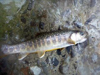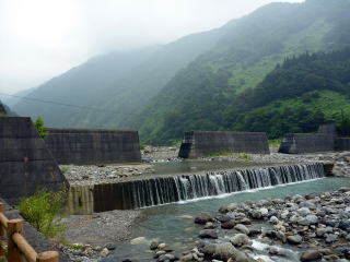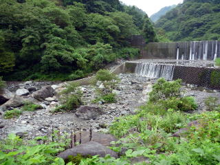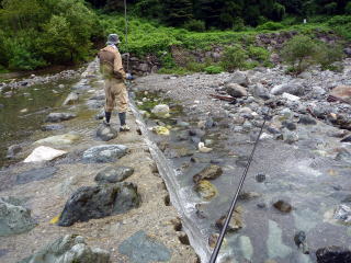 | 翌朝、5時過ぎに起床。 天気が気になるが何とか午前中くらいはもって欲しいと思いながら出発した。 車止めに到着し、釣り支度をしているといきなりアブの襲撃を受けた。 川に降りる道ではかなりの数になってきた。 両手を振り回しながら早足で歩いたが何箇所かは食われた。 河原に降りると幾分減ったが、それでも気になります。それに加えてこの渇水状態では釣り欲もそがれますわ。 私はアタリも無かったが、ふとつかさくんを見るといきなり竿を抜き上げたかと思うと、小振りのイワナが宙を舞っていた。 哀れそのイワナは河原でピクピクと何が起きたのか判らない状態であったが、しばらくして流れの中に消えていった。 下の小堰堤に移動。ここも釣れる気配がしない。 そして、いきなり「パチン」と音がしたので何事?とつかさくんを見ると、竿が足元に落ちていた。 どうやら手が滑って竿を落としたようだった。だが、なんと落としたその竿には良型のイワナが掛かっていたのだ。 堰堤の上から釣っていたので、いきなり抜き上げたイワナは再び宙を舞い、今度は上流の流れに消えていったのであった。 つかさくんが、ここで戦意喪失となったのは言うまでもないだろう。 それを見ていた私は、静かにその場を離れた。そして2匹のイワナを釣ったところで青海川を諦めた。 |